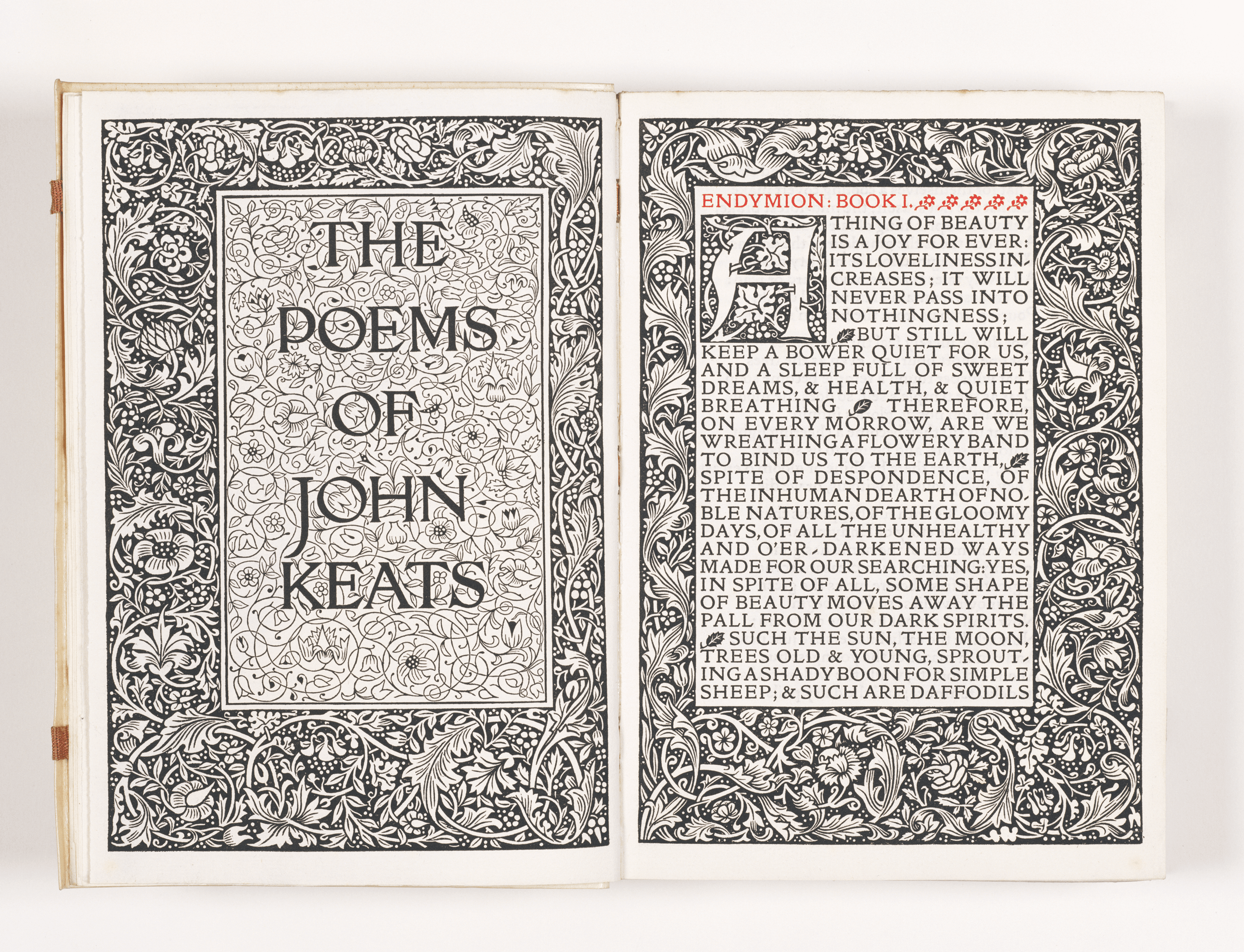 晩年になり、モリスは書物の私家版印刷工房「ケルムスコット・プレス」を創設し、全53書目、66冊の書物を出版。「書物というものはすべて〈美しい物〉であるべきだ」という願いのもとに美しい活字・用紙・印刷・装丁で製本することを実証した。その集大成としてバーン=ジョーンズの挿絵、モリス自身による題扉、大型縁飾り、装飾頭文字のデザインの「ジェフリー・チョーサー作品集」がある。